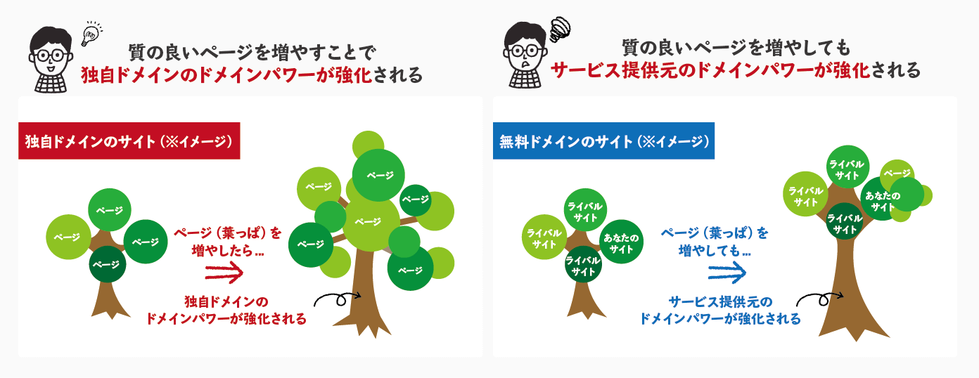閲覧ユーザーにとって質の良いサイトに作り上げていくことで、独自ドメインの場合はドメインパワーが強化されますが、無料ドメインだとそうはいきません。